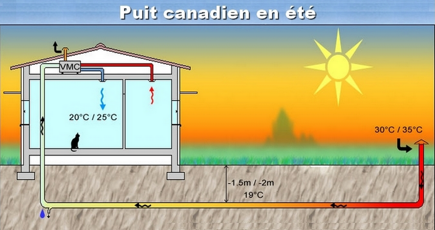 Le puits canadien, par l'énergie contenue dans le sol, à deux fonctions : fournir de la chaleur en hiver et de la fraîcheur en été, pour une faible consommation électrique supplémentaire.