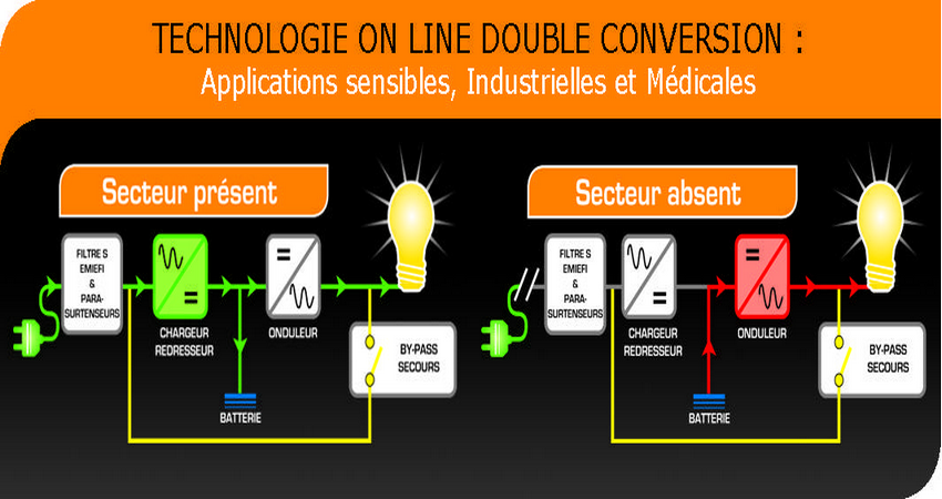 L’onduleur « lisse » la tension électrique, en supprimant les crêtes dépassant un certain seuil. En cas de coupure de courant, l’énergie emmagasinée dans la batterie de secours maintient l’alimentation des matériels pendant un temps donné, selon la puissance de l’onduleur et le nombre d’équipements maintenus en fonctionnement. Cela permet d’éteindre proprement les systèmes informatiques en cas de coupure prolongée. Certains onduleurs peuvent également être interfacés avec l’ordinateur ou le serveur (USB, série, IP) et leur éviter ainsi les coupures brutales.